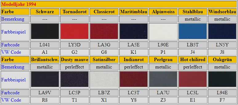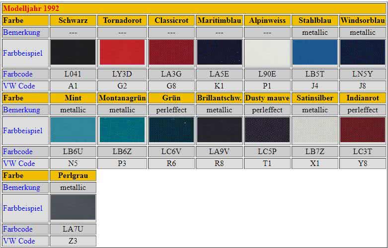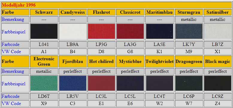 Цветовые коды автоэмалей, которыми окрашивались автомобили немецкого автоконцерна Volkswagen. Наклейка, на которой среди прочих характеристик нанесен код краски данного автомобиля, часто находится в закрытых местах. Например, в багажном отделении. Знать буквенно - цифровой номер эмали часто полезно в тех случаях, когда вы собрались самостоятельно покрасить автомобиль.