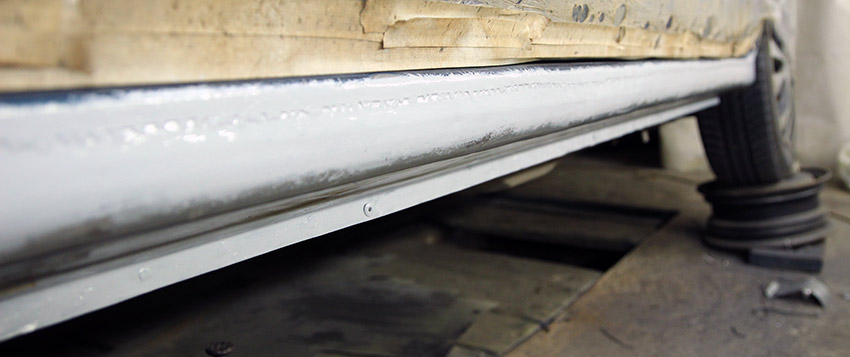 После нанесения нескольких слоев эпоксидного грунта, неровности поверхности порога в месте сварочного соединения были выравнены шпатлевкой с содержанием стекловолокна (Fiber Micro). Далее, уже ровная поверхность порога снова была покрыта эпоксидным, а после него акриловым грунтом под покраску.
