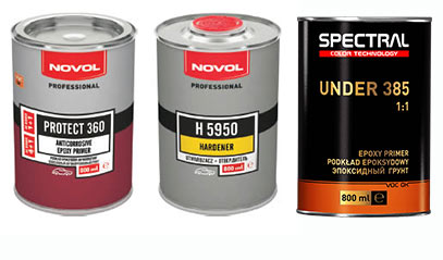Среди множества различным марок и производителей заслуженной популярностью пользуются материалы фирмы Novol. Среди них эпоксидные грунты Novol Protect 360 и Spectral Under 385. Благодаря высококачественным смолам и различным активным добавкам в составе этих грунтов, их применение обеспечивает надежную защиту металлической поверхности кузова автомобиля.